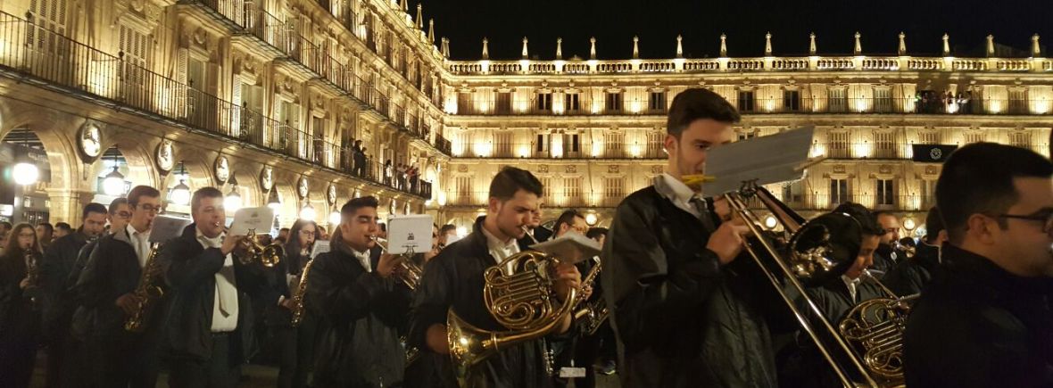 Nuestra asistencia a la Semana Santa de Salamanca se remonta a 1995, desfilando con la Hermandad del Amor y de la Paz durante dos años en su procesión del Jueves Santo y en la del Cristo de la Liberación en la madrugada del Sábado Santo. Desde 1997 es la banda encargada del paso de la imagen de Nuestra Señora de la Soledad y, desde 2008, desfila junto a Nuestra Señora de las Lágrimas de la Hermandad de Jesús Flagelado el Miércoles Santo.
